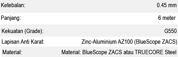 Reng Smartruss (Lysaght) umumnya menggunakan profil Topspan (TS35/TS40/TS30) dengan ketebalan standar 0.45 mm – 0.50 mm. Material yang digunakan adalah baja lapis Zinc-Aluminium berteknologi tinggi BlueScope ZACS atau TRUECORE dengan grade baja G550 (kuat tarik 550 MPa) dan lapisan anti karat AZ100/AZ150, memberikan ketahanan tinggi terhadap rayap dan cuaca. Reng ini dirancang untuk kompatibilitas tinggi dengan sistem rangka atap Smartrussdan sering diaplikasikan dengan perangkat lunak SUPRACADD untuk akurasi pemasangan. Keunggulan: Tahan api (tidak merambatkan api), tahan rayap, akurat, dan ringan.